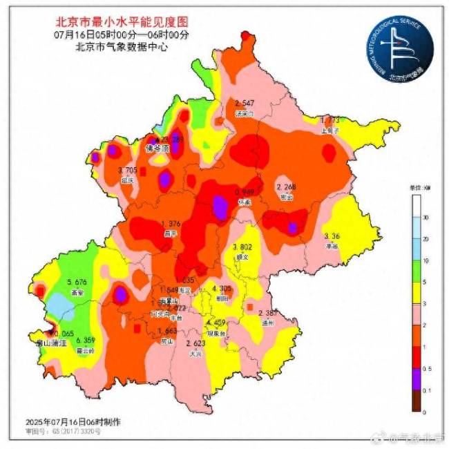 北京天气实况今天(7月16日)早晨有轻雾,能见度低,大部分地区能见度1~3公里,局地能见度低于500米,对早高峰交通出行不利,请注意交通安全