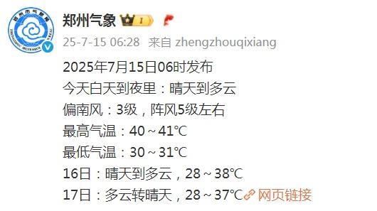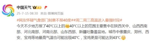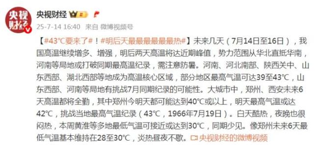 近期,我国正在经历一场大范围、高强度的高温过程。7月15日至16日,高温范围扩大、强度增强,陕西关中、四川盆地、河南、湖北等地部分地区最高气温可超过40℃,局地或突破历史同期极值,公众请注意防暑降温。东北等地多阵雨或雷雨,江苏、安徽等地明起或遭强对流天气,需注意防范。